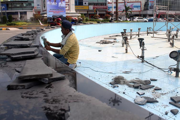 PotretBisnis.com, MEDAN- Pekerja melakukan perbaikan meratakan ubin air mancur di bundaran Majestik Jalan Gatot Subroto Medan, Senin (20/4). Kegiatan ini merupakan upaya perawatan sekaligus memelihara fasilitas umum di Medan. PotretBisnis/Obby Regar