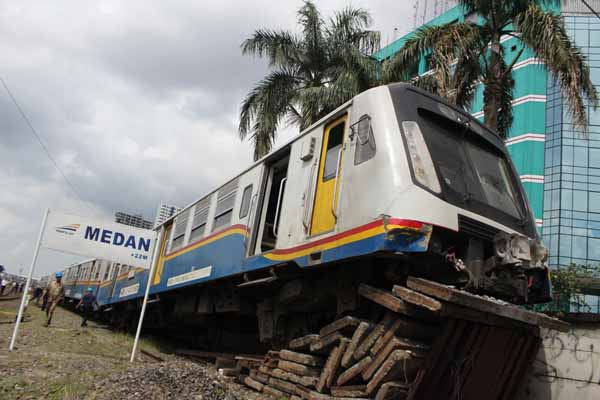 PotretBisnis.com, MEDAN- Kereta Rel Diesel Indonesia (KRDI) Sri Lelawangsa keluar jalur perlintasan dan menabrak tumpukan beton dan di Stasiun Besar Kereta Api, Medan, Sumatera Utara, Selasa (15/12). Tidak ada korban jiwa pada peristiwa yang terjadi sekira pukul 15.00 Wib tersebut. KRDI ini biasanya melayani rute Medan-Binjai dan Tebing Tinggi. menurut petugas KA kereta tersebut hendak parkir di kawasan stasiun, namun tidak berhenti tepat di ujung perlintasan sehingga menabrak tumpukan beton dan besi. “Tadi baru jalan dari bengkel untuk uji coba lintasan’, katanya.