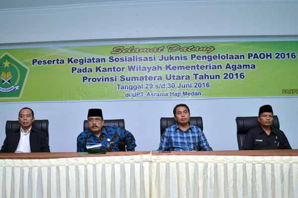 PotretBisnis.com, MEDAN– Kepala Kantor Wilayah Kementerian Agama Sumatera Utara Drs.H Tohar Banyoangin M.Ag (kedua kanan) bersama Ketua Panitia H.Syawal Harahap S.Ag, M.Si, Pjs Bidang Pengelolaan Haji dan Umrah Drs.H Bahrum Saleh, MA dan Narasumber dari kementerian Agama Jakarta H. Supiyanto pada acara Sosialisasi Juknis pengelolaan POAH 2016 di Upt Asrama Haji Medan, Kamis (30/6). Kegiatan tersebut dihadiri oleh pejabat Kasi Haji Kabupaten dan Kota Se Sumatera Utara. PotretBisnis/Ilyas Arif Lubis
