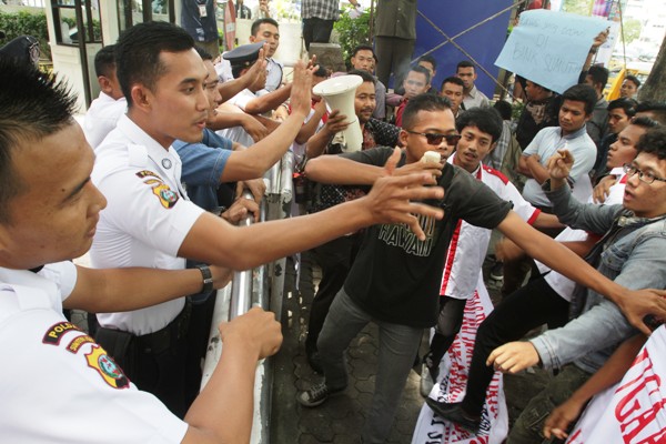 PotretBisnis.com, MEDAN– Sejumlah demonstran yang tergabung Pemuda Lumbung Informasi Rakyat Kota Medan terlibat aksi saling dorong dengan petugas keamanan saat berunjuk rasa di Kantor Pusat Bank Sumut, di Jalan Zainul Arifin, Medan, Sumatera Utara, Kamis (9/3). Dalam aksinya mereka mengecam adanya tindakan penyalahgunaan wewenang menggunakan demosi, promosi dan mutasi pegawai selama kurun waktu tahun 2014-2016, serta dugaan adanya konflik kepentingan Direktur Utama PT Bank Sumut dalam penunjukan lembaga jasa konsultan yang berpotensi kepada tindak pidana korupsi dalam penerimaan pegawai tanpa melalui mekanisme lelang tahun anggaran 2015 dengan modus pemecahan paket lelang. PotretBisnis/Andi Rambe
