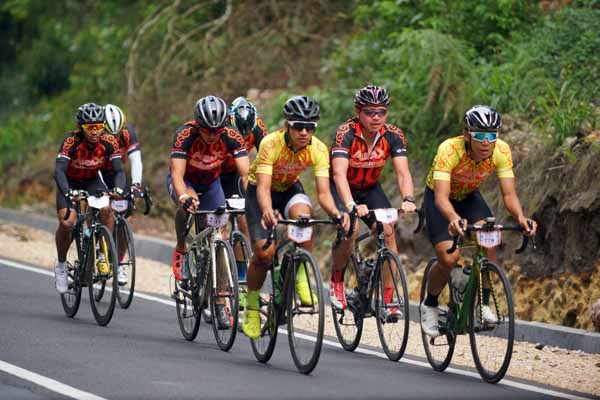 Para pegowes mulai mengayuh sepeda jenis road bike dari kawasan Tuktuk Siadong, Samosir, Minggu (29/4). Lintasan kali ini, akan melewati 3 kabupaten. Mulai dari Kabupaten Samosir, kabupaten Dairi hingga kabupaten Karo.
