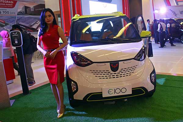 PotretBisnis.com, MEDAN– Sales Promotion Girl berpose bersama Mobil listrik Wuling E100 di acara GIIAS 2018, di Santika Dyandra Hotel, Medan, Rabu (31/10). Wuling memboyong mobil listriknya E100 langsung dari China yang merupakan produk anyar Wuling yang dirilis di negara asalnya pada 2017, dan mampu berlari sampai 200 km dengan sekali ngecas. PotretBisnis/Obby Regar