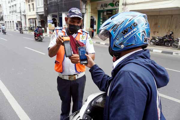 Seorang Pengendara melakukan pembayaran parkir motornya secara non tunai melalui QRIS BCA Mobile Banking di Jalan Ahmad Yani, Medan Sumatera Utara, (13/12/2021).Pemerintah Kota Medan melalui Dinas Perhubungan terus meningkatkan sistem pembayaran Parkir Non Tunai atau Parkir Elektronik (E-Parking) dengan menggunakan sistem QR Code serta bisa juga menggunakan kartu debit (ATM) dari semua Bank salah satunya Bank BCA. PotretBisnis/Andi Rambe