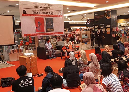 Hal ini diungkapkan penulis Eka Kurniawan di depan puluhan peminat buku-bukunya pada event Nobar: Nongkrong dan Nonton Bareng Eka Kurniawan, di Gramedia Medan Manhattan, Sabtu (10/8) pukul 14.00 WIB sampai selesai. “Niat awal kita (menulis) untuk membantu kita mengingat. Tetapi ketika dituliskan, kita butuh membacanya kembali. Jadi, kita ternyata tidak hanya harus menulis supaya bisa dibaca kembali tetapi juga agar bisa dimengerti orang lain, supaya kita juga paham. Dari situlah kebutuhan manusia untuk menulis menjadi meningkat, tidak hanya sekadar mengingat tetapi untuk komunikasi yang akan lebih mudah dipahami. Dengan konversi, saya mengerti, kamu mengerti, artinya tujuannya tercapai,” katanya.